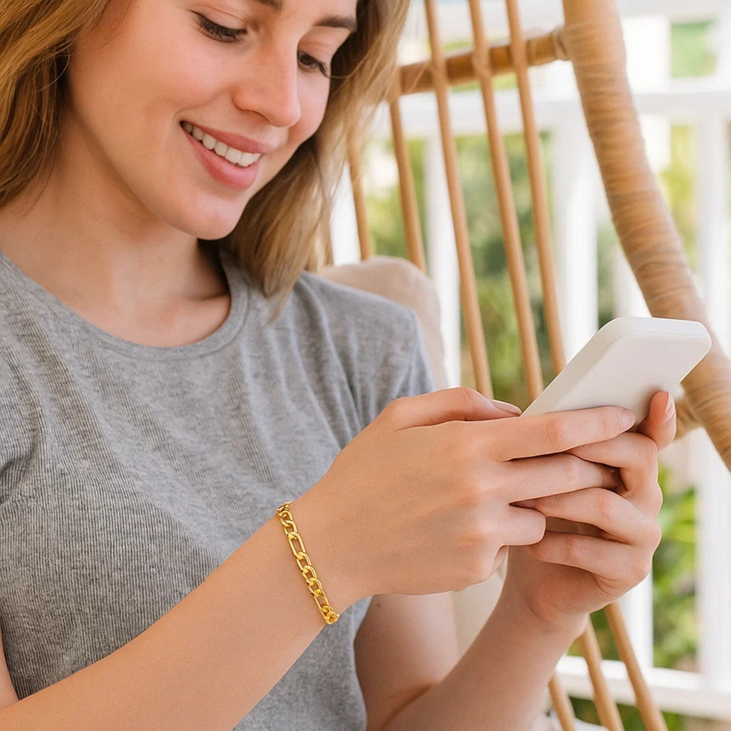 This Lite Figaro bracelet comes in 10k yellow gold and has a width of 4.6 millimeters. Secured with a lobster clasp.