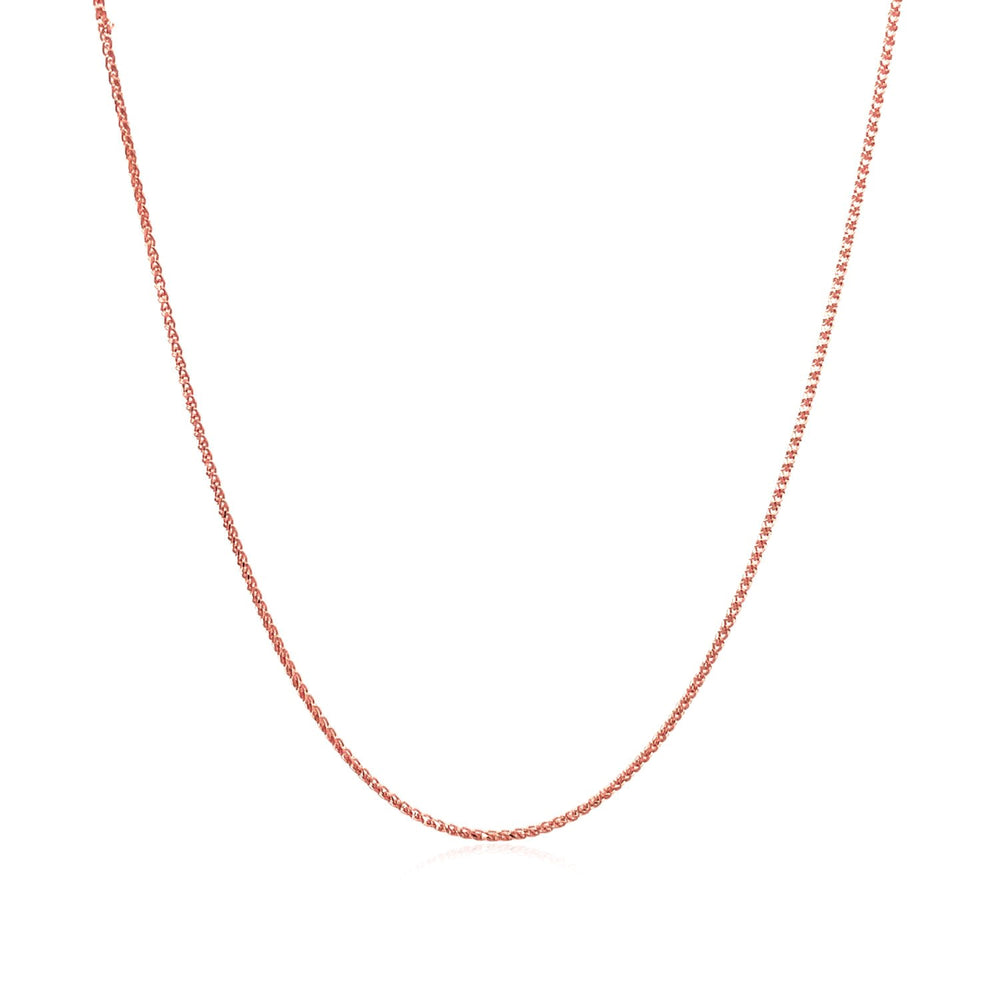 A diamond cut round wheat chain comes in 14k rose gold and has a width of 0.60 millimeters.