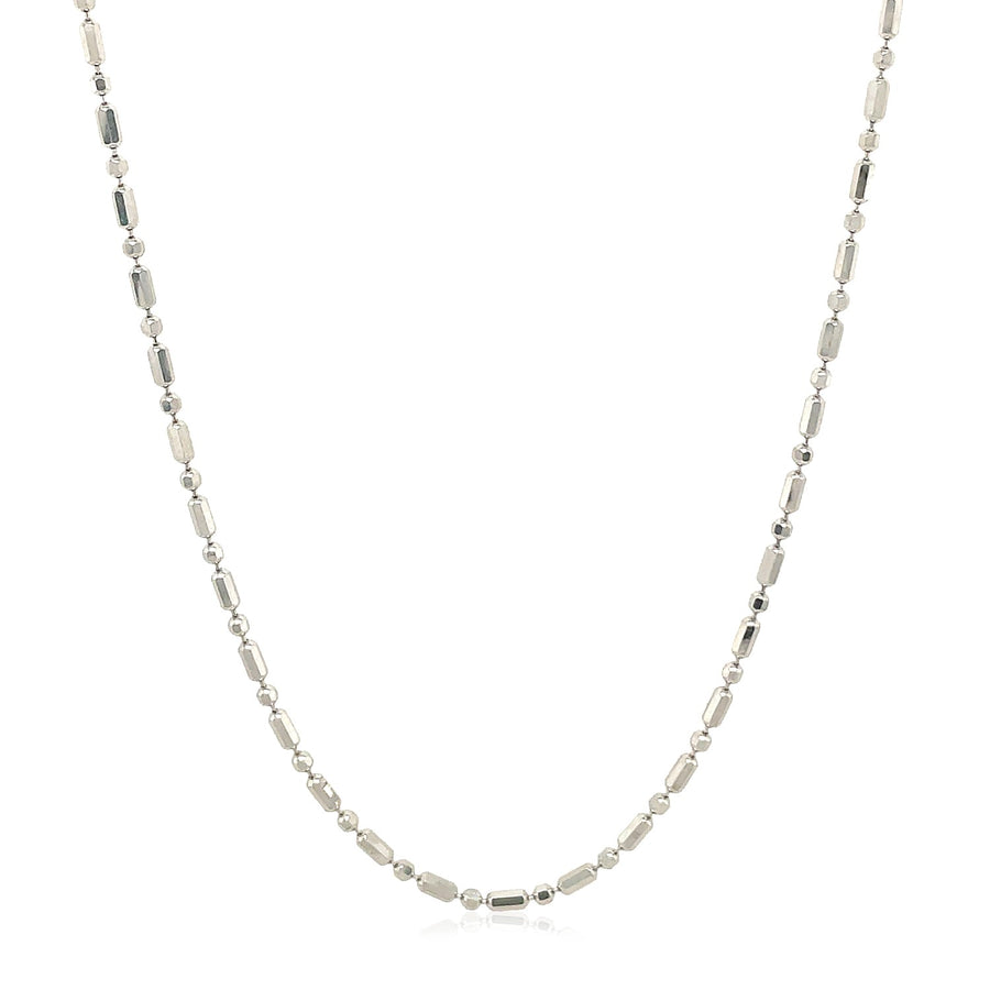This diamond cut alternating bead chain comes in 14k white gold and has a width of 1.30 millimeters.
