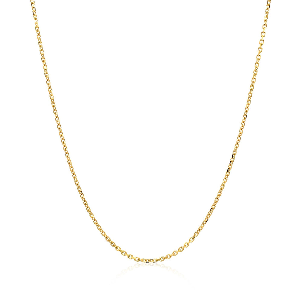 This diamond cut cable link chain comes in 14k yellow gold and has a width of 1.10 millimeters.