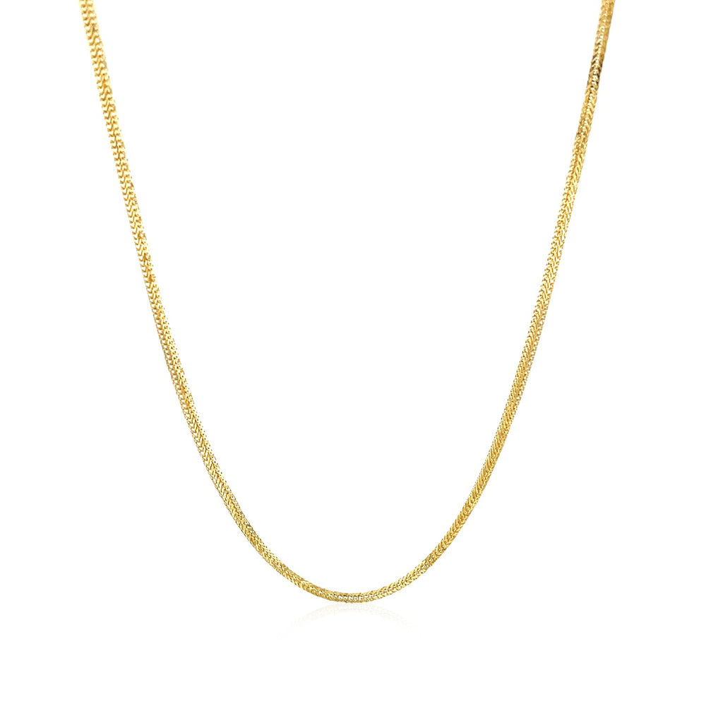 The designed in fine 14k yellow gold, this chain is a classic and an essential in any jewelry collection. Showcasing a foxtail design, this comes in sizes 16 inches, 18 inches, and 20 inches and is secured with a lobster lock.