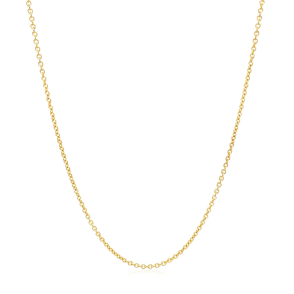 This oval cable link chain comes in 14k yellow gold and has a width of 1.2 millimeters.