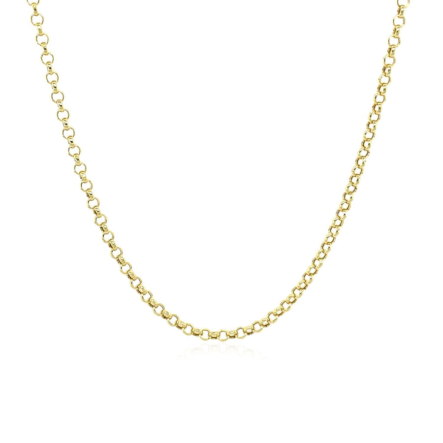 This rolo chain comes in 14k yellow gold and has a width of 1.9 millimeters.