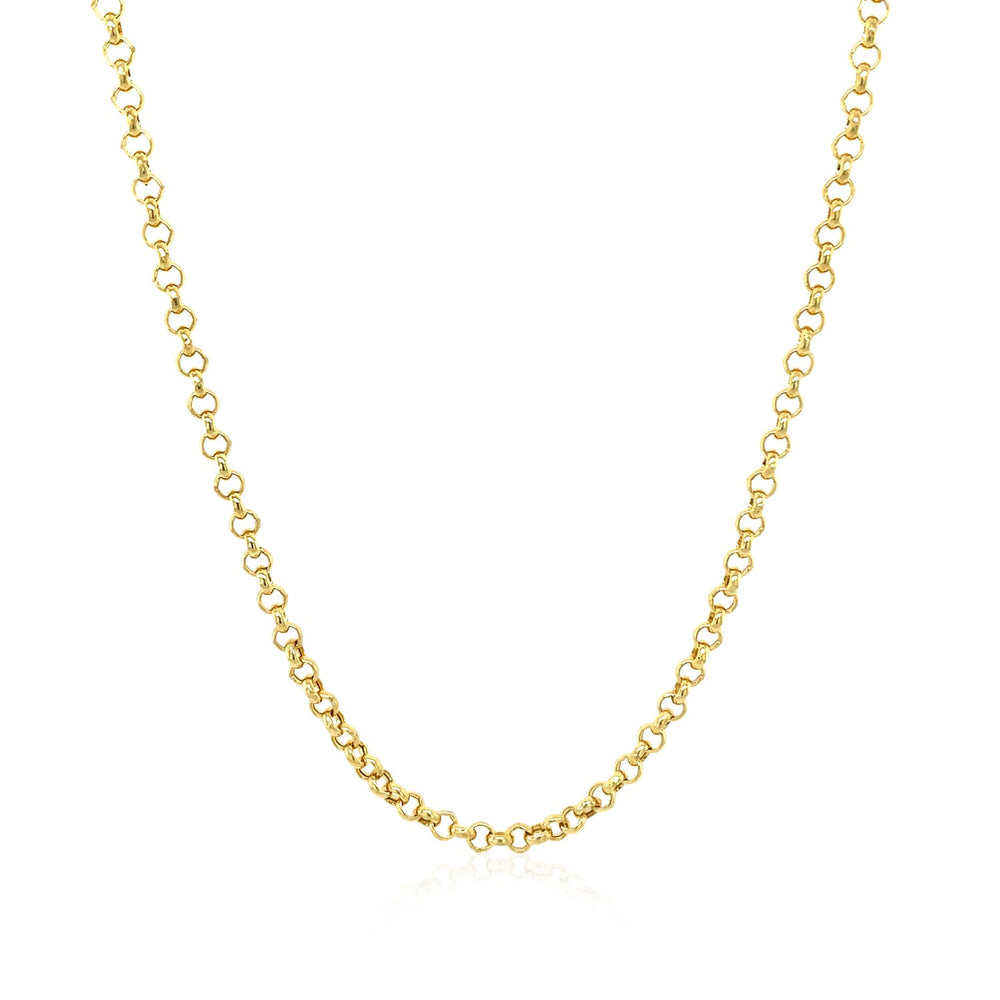 This rolo chain comes in 14k yellow gold and has a width of 2.50 millimeters.