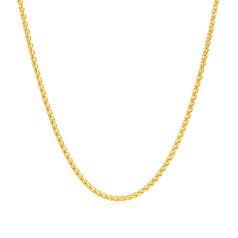 This round wheat chain comes in 14k yellow gold and has a width of 1.5 millimeters.