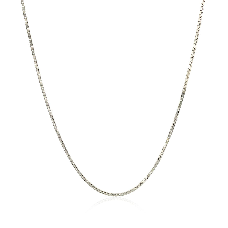 This classic box chain comes in 10k white gold and has a width of 0.78 millimeters.