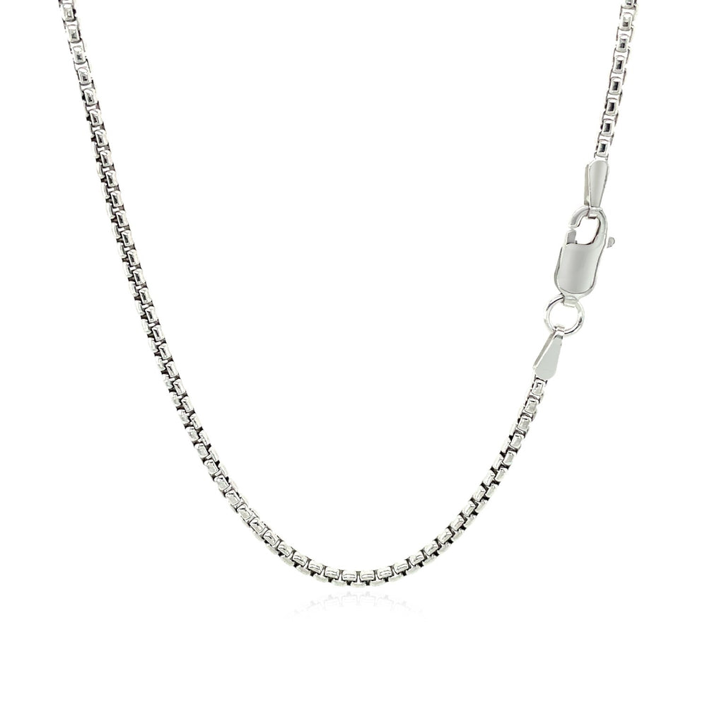 This round box chain comes in 14k white gold and has a width of 1.8 millimeters.