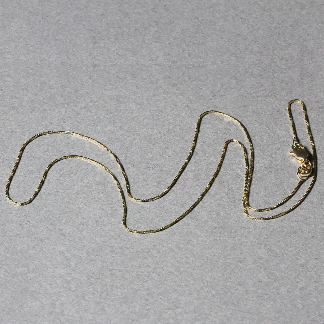 This classic box chain comes in 14k yellow gold and has a width of 0.60 millimeters.