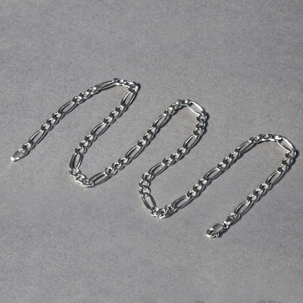 This solid Figaro chain comes in 14k white gold and has a width of 4.50 millimeters.